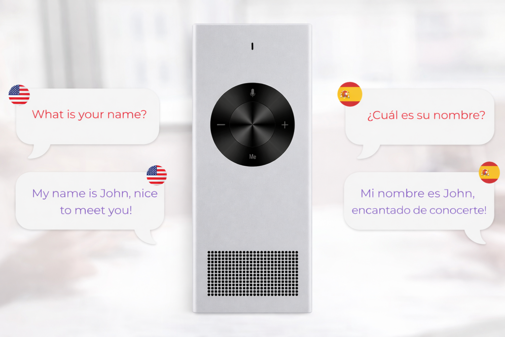 Getting started is simple. Just power on the device, select your languages, press the button, and speak. The built-in speaker instantly plays the translation out loud, making conversations feel smooth and natural.